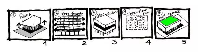 此后,柯布的建筑理念逐步完善,在1926年提出了新建筑五原则,它们是: