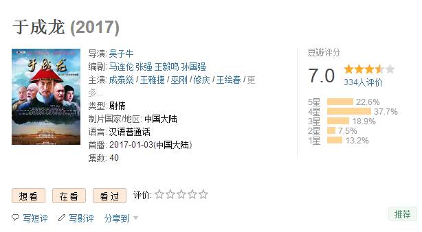 《于成龙》开播之后,收视率不断走高,目前更在豆瓣拿到7.0的高评分。
