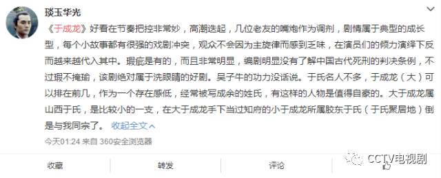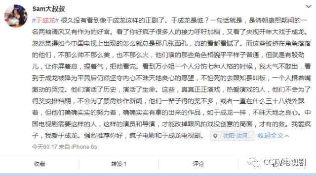 网友SAM大叔说:“这些真真正正演戏、热爱演戏的人,他们不会为了得奖安排档期,不会为了票房炒作新闻,他们一辈子得的奖不多,但他们确确实实地努力着,确确实实有拿得出来的作品,如于成龙一样不昧天地之良心。中国电视剧需要这样的人,这样的演员和导演,才能改掉跟风拍戏没创意的局面,才有的救。”