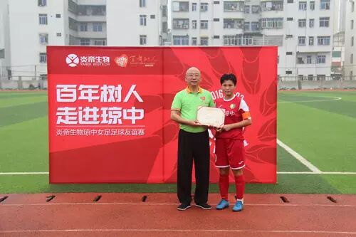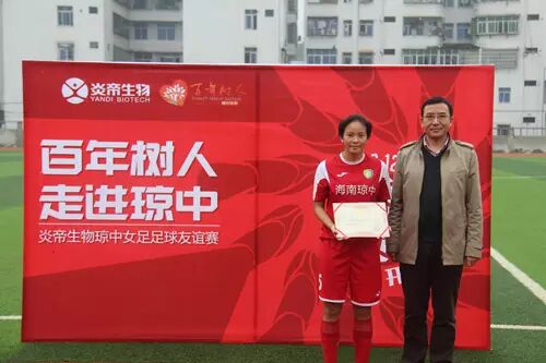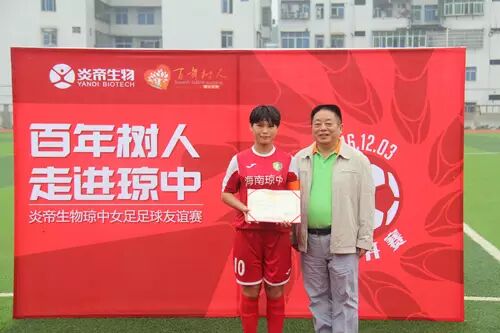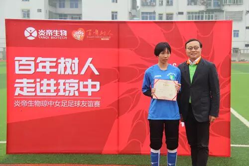 炎帝生物行政中心总经理兼百年树人基金会理事长万义先生为琼中女足队队长王静怡颁发“最佳助攻”奖。