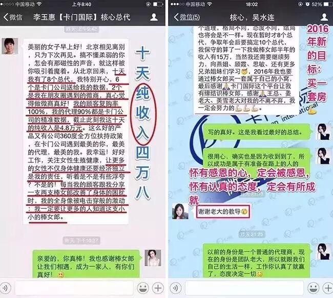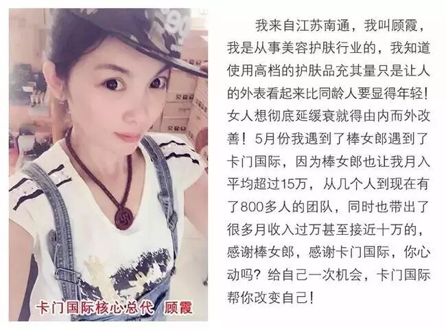 卡门的代理,大多是从600元起家的“小白”,但是经过几个月的磨练,她们从当初微信都不会玩的菜鸟,成长为拥有上千人团队的“大咖”!她们,有的是普通的石油工人;有的是全职带娃的宝妈;有的是平凡的教师;有的是经济不独立的主妇;甚至还有50多岁的中年大姐……她们曾经迷茫过、卑微过、渺小过;她们曾经没有存在感,不知道自己的价值何在,但是,通过加入【卡门国际】,跟着王丽丹创业,她们发现了一个全新的世界,获得了全新的生命!