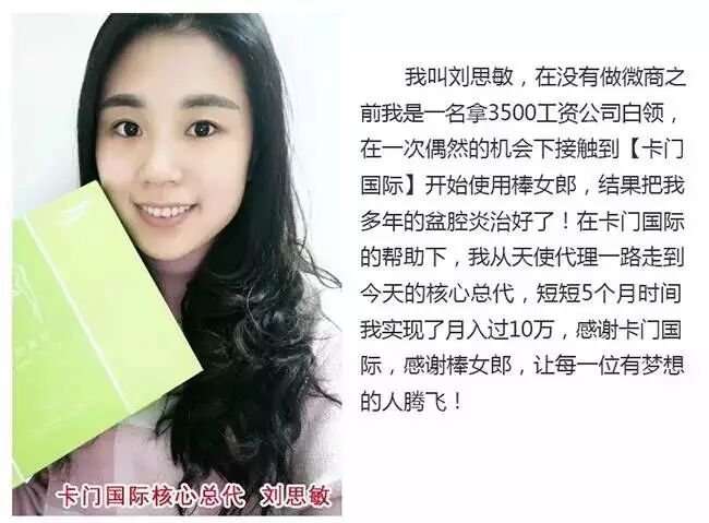现在,王丽丹和她的【卡门国际】,以及旗下“棒女郎”品牌,正在吸纳更多有志于微商创业的女人。微商不用高大上,从低做起最踏实,只要600元,8盒产品,就可以拿授权,做微商,卖最热销的女性私处排毒产品。20万代理都已经赚钱,你还有时间等待吗?添加王丽丹的微信号,看看她的朋友圈,做不做你来决定!