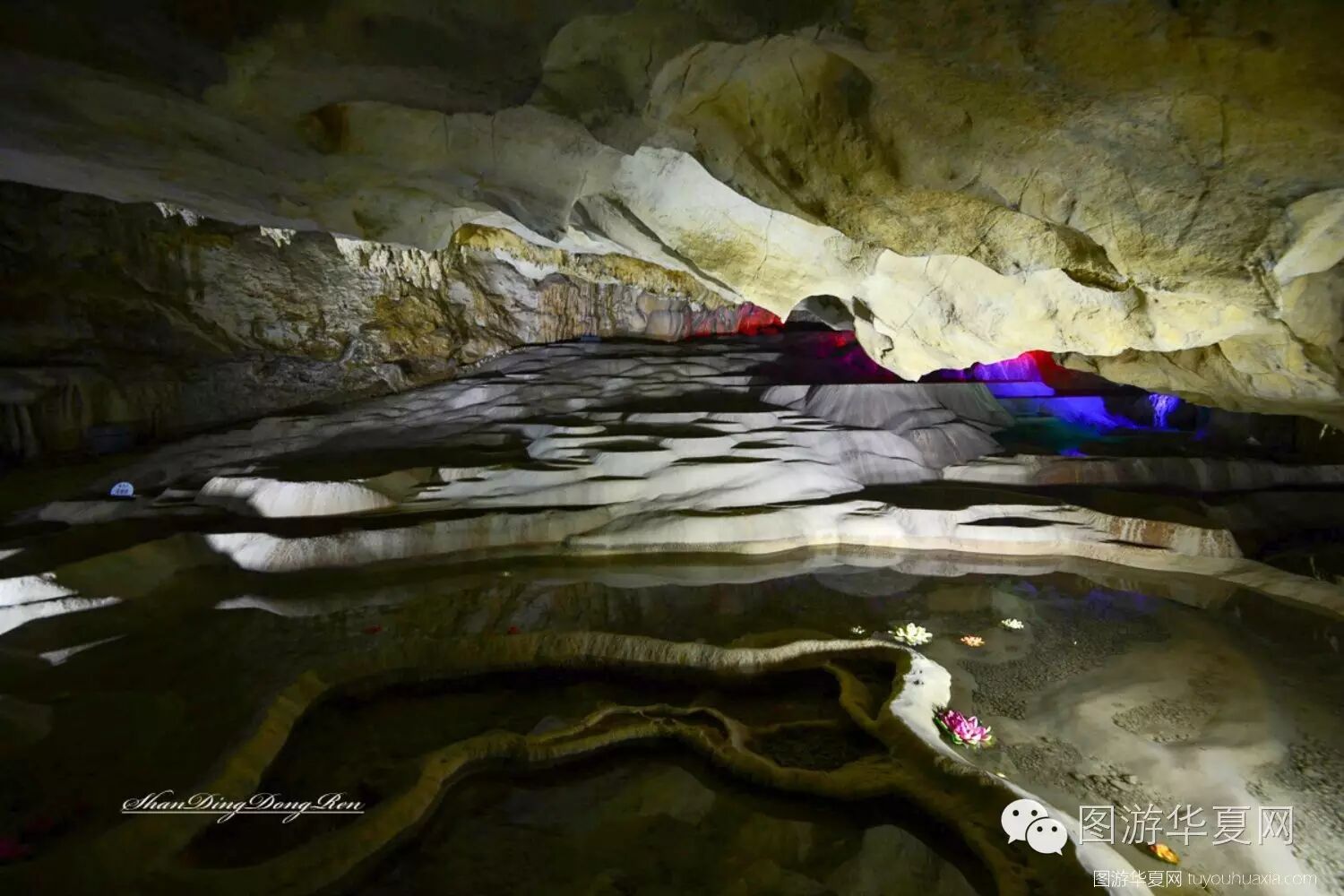整个洞内景观奇绝,是目前世界上少有的莲花洞景,它与众不同,盆盆相叠,盆中有盆,盆中有柱,盆中长“树”,奇景不断---- 好像一幅天然画卷,在五彩灯光的照耀下,让人感觉进入了梦幻般的世界。