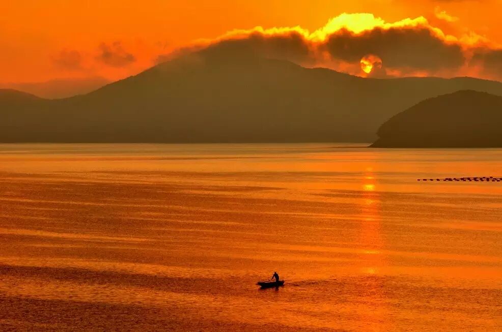 桓龙湖,一个秀丽山川中的澄碧湖泊,却有海一般辽阔的浩浩荡荡,横无际涯。清晨时分,水汽氤氲,山水朦胧,更是如水墨丹青般充满诗情画意。而日落时,又化作了一幅金光闪闪的铜版油画。