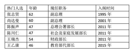 两位副总理张志贤和尚达曼虽可以轻松胜任代总理,但分别只比李显龙小2岁和4岁,而且尚达曼为少数种族,不一定能被以华人为主的新加坡社会接受。不过不久前,尚达曼也明确表示自己不是下任总理人选,他本身没有志向担任总理,只擅于提供咨询和辅佐总理。王瑞杰一直备受热捧,他现年55岁,官僚精英出身,曾是李光耀的私人秘书,,现任财政部长。在新加坡政坛上,财政部长一般都被提拔为更高级别的领导,比如李显龙总理也曾担任过财政部长,尚达曼在任副总理前也担任较长时间的财政部长。但是王瑞杰于今年5月中风入院,现虽康复并重返岗位,但出任下届总理的可能性也被大打折扣。陈振声和陈川仁均为军人出身,也是热门人选。但是陈振声的领袖魅力并不突出,不足以使他有能力带动整个国家。而陈川仁在曾经的人力部和目前的社会及家庭发展部中,都没有发挥太多影响力。,他担任过劳动力发展局局长,还担任过三年李显龙总理的首席私人秘书。王乙康在2011年的大选中落选,。在去年大选中获选后,王乙康直接出任代部长,可谓是“火箭式”的擢升。但王乙康毕竟是新入阁,要在下届大选前积累足够的经验也不容易。