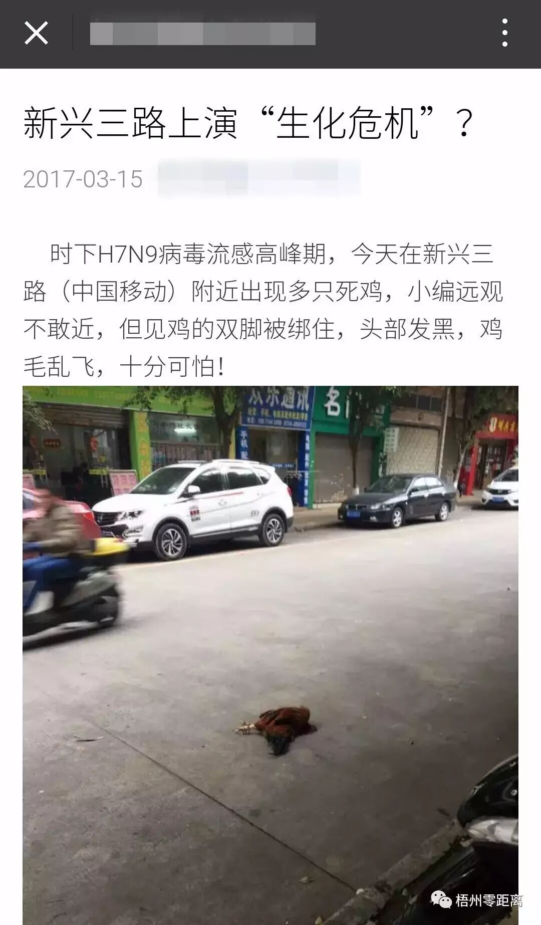 3月16日,有网友向零妹报料,前天(3月15日),本地一个自媒体公众号发消息称,“新兴三路(中国移动)附近出现多只死鸡……鸡的双脚被绑住,头部发黑,鸡毛乱飞,十分可怕!”,并配了两张图片,图片上显示人行道和机动车道上各有一只鸡躺在路上。这个说法,让一些不明就里的网友,被唬住了。