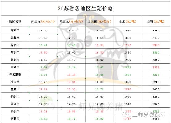 江苏省各市外三元生猪价格如下:最高苏州市17.60元/公斤,最低徐州市16.41元/公斤,截止11月22号为止江苏省外三元生猪平均价格为16.96元每公斤左右。