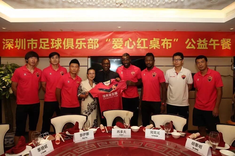9月9日中午,在深圳市足球俱乐部、深圳市关爱行动公益基金会、深圳晚报等机构的倡议和组织下,深圳佳兆业队主教练西多夫携外援阿布、、黎斐、任鹏、耿晓顺,在佳兆业中心嘉美轩精细潮州菜餐厅进行了一顿特别的午餐。之所以特别,是因为本次午餐是“爱心红桌布”公益行动的深足专场活动,午餐的餐费将直接捐助给患有“地中海贫血病”的儿童。