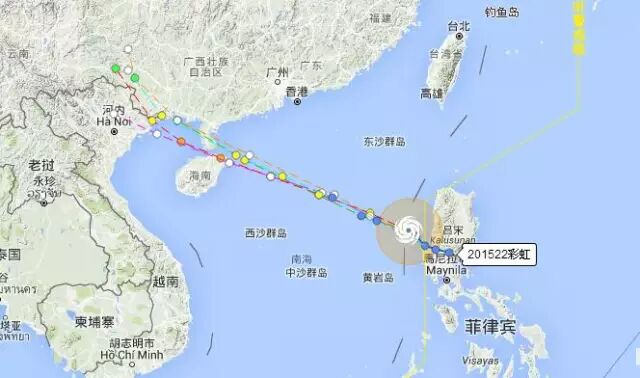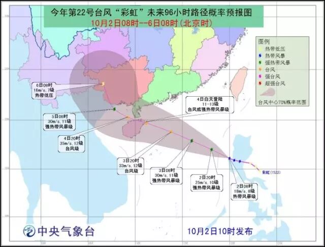 预计,“彩虹”将以每小时20公里左右的速度向西北方向移动,将于今天中午进入南海东部海域,强度逐渐加强,最强可达强热带风暴级或台风级(11-13级,30-35米/秒);逐渐向海南东部到广东西部一带沿海靠近,可能于4日白天以其极值强度在上述沿海登陆,登陆后继续向西北方向移动,强度逐渐减弱。10月3-5日华南中西部将有较强风雨天气,其中广东西南部、广西南部、海南等地部分地区有暴雨或大暴雨(100~200毫米)。消息来源:中央气象台
