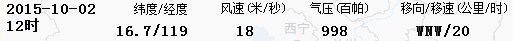 菲律宾附近的热带低压于今天(2日)凌晨加强到热带风暴级,编号为今年第22号台风彩虹(英文名:Mujigae;名字来源:朝鲜;名字意义:天空中的彩虹),今天上午12时18分其中心位于北纬16点7度、东经119点3度,也就是在距离湛江约1170公里的菲律宾吕宋岛上,中心附近最大风力位于北纬16.7°、东经119.3°,最大风速18m/s,中心气压998hPa。