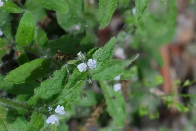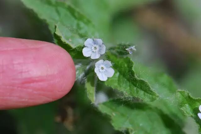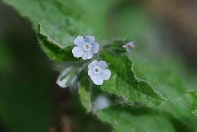 跟附地菜是兄弟,它们都是紫草科的成员,所以花朵很像,只是斑种草的花大了许多。并且它们的叶子也更宽阔和厚实。如果去看看勿忘我的花朵,就会发现它跟这两种小草很像,因为勿忘我也是紫草科的哦。