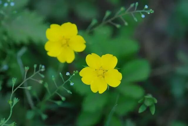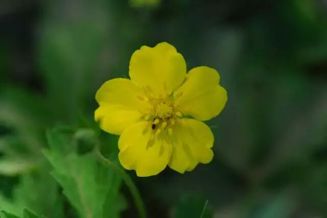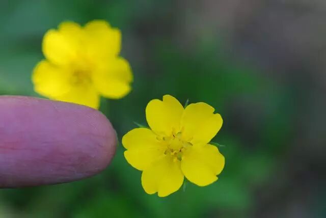 萎陵菜的花朵要鲜艳多了,在附地菜前面就是个巨无霸,但是花朵也只有食指大小。虽然花朵长得跟草莓花有几分相像(谁让它们都是蔷薇科的),但是着花朵可不会结出草莓的。