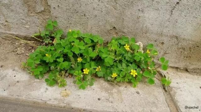 在路边经常能看到一种小黄花,叶子也是三瓣的。所以有人叫这个三叶草。不过呢,真正的三叶草是豆科的。这个小草是酢浆草,酢浆草科酢浆草属。它们总是出现在这样的犄角旮旯里面。