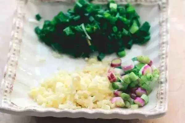 第二步:将蒜切碎,与洋葱末和葱花一起备用。