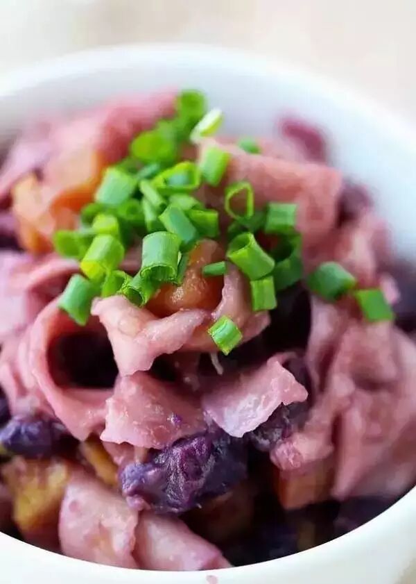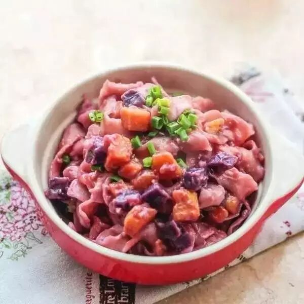 主材料:250克新鲜宽面条、1个中等大小红薯、1/2个中等大小紫薯、2匙食用油、大蒜4瓣、1匙洋葱末、适量水、2匙盐、1匙芝麻油、1匙生抽、1匙葱花