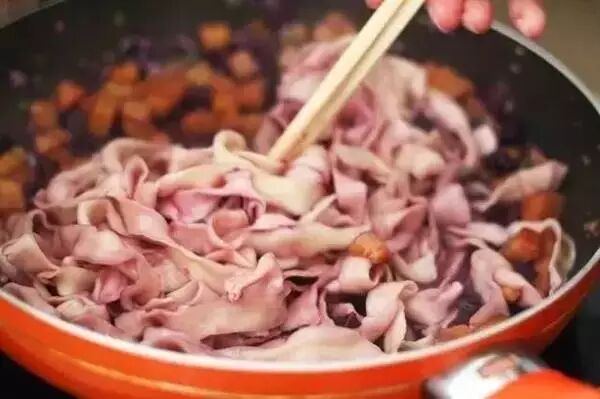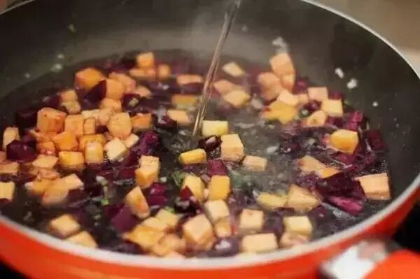 第三步:倒入红薯块和紫薯块,翻炒几下与葱蒜等混合。