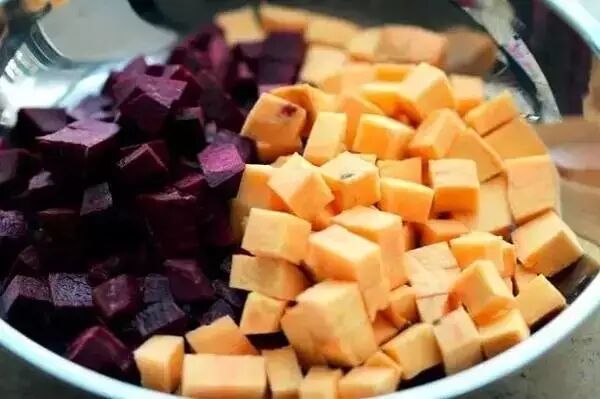第一步:将红薯和紫薯削皮并切成均匀的小方块备用。