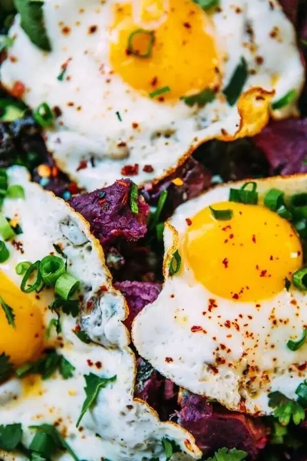 第五步:将紫薯、甘蓝、洋葱盛入平底锅或盘中,放入煎好的鸡蛋,加入切好的香菜叶和葱花装饰。