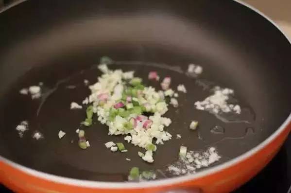 第三步:平底锅入油加热,将蒜末和洋葱末用旺火煸炒出香味。