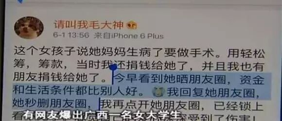 不过在6月1日,有网友发现,这名女生将支付宝余额贴在朋友圈。又经常晒“吃喝玩乐”,更没有更新母亲的病情。有捐款人士认为自己的爱心被利用,自己的善意遭到了欺骗。