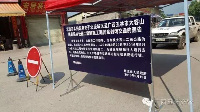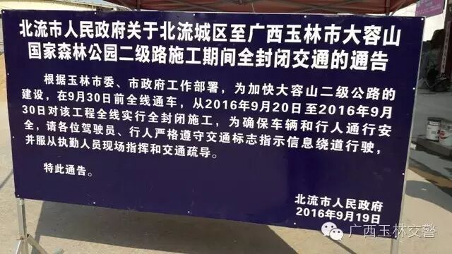 车主注意啦! 根据玉林市委、市政府工作部署,为加快大容山二级公路的建设,在9月30日前全线通车,从2016年9月20日至2016年9月30日对该工程全线实行全封闭施工,为确保车辆和行人的通行安全,请各位驾驶员、行人严格遵守交通标志指示信息绕道行驶,并服从执勤人员现场指挥和交通疏导。