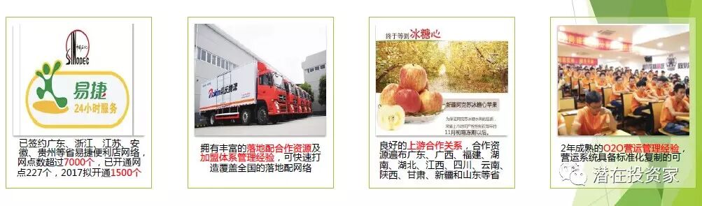 该公司已签约广东、浙江、安徽、贵州等省中石化易捷与悦来悦便利店,签约网点数7000多个,已开通网点227个,2017拟开通1500个拥有丰富的落地配合作资源及加盟体系管理经验,可快速打造覆盖全国的落地配网络。良好的中上游供应商合作关系,合作资源遍布广东、广西、福建、湖南、湖北、江西、四川、云南、陕西、甘肃、新疆和山东等省2年成熟的O2O营运管理经验,营运系统具备标准化复制的可行性。