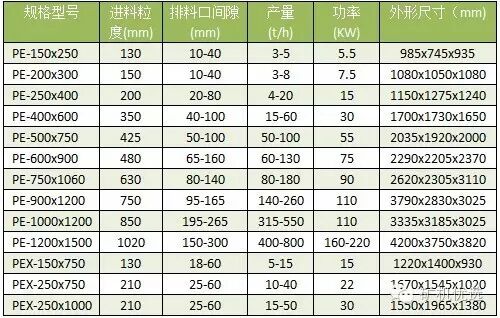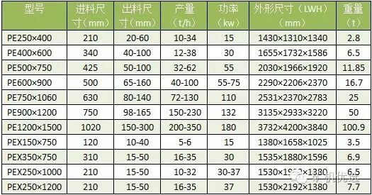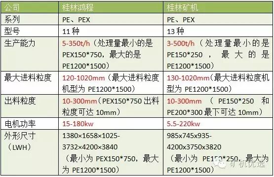 1) 两者的鄂破型号都比较多,桂矿略胜一筹,其PE系列比鸿程多了3个型号:PE150*250、PE200*300和PE1000*1200(可参考以下产品技术参数表);