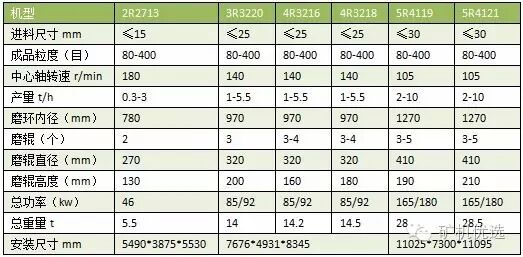 桂林矿机R型摆式磨粉机参数表(数据来源其官方网站,不包含改进型)