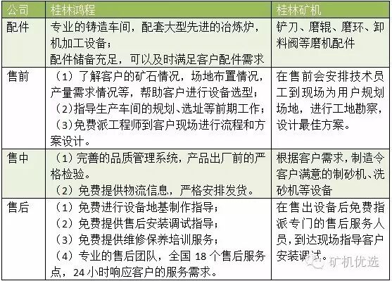 系统完善的企业服务为鸿程增添了一笔亮色,从售前、售中到售后,它都有专业的售后团队全天候为用户提供服务。对于主营设备类型,鸿程和桂矿都有各自的优势产品,具体如下所示: