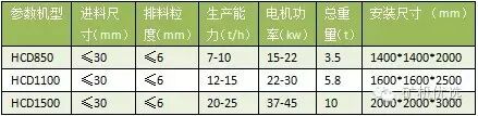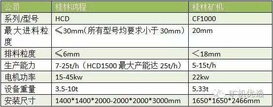 5) 从电机功率、设备重量和尺寸上可以看出,桂矿的CF1000型号比较接近鸿程的HCD1100型号,两者的最高产能都是15t/h。