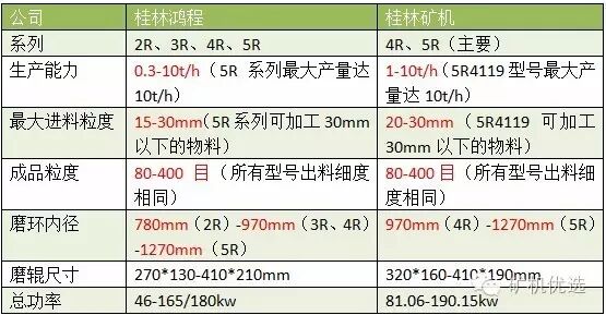 5) 两者在生产能力上实力相当,但在总功率上桂林鸿程更占优势,同系列R磨粉机耗电量更大,生产成本较高。