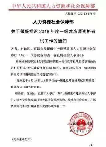 最近网上流传的关于“2016年一级建造师考试推迟”公告,也就是“人社部函[2016]158号”,广西建设教育网小编提醒广大考生,该公告是假的,请大家抓紧时间备战2016一级建造师考试!