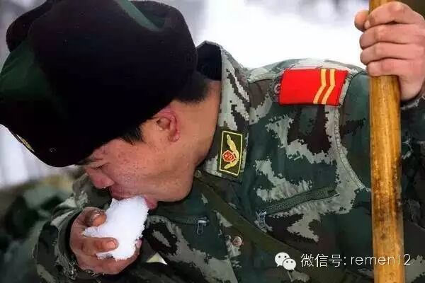 2008年2月3日,一名武警战士在京珠高速公路破冰铲雪间隙用冰解渴。