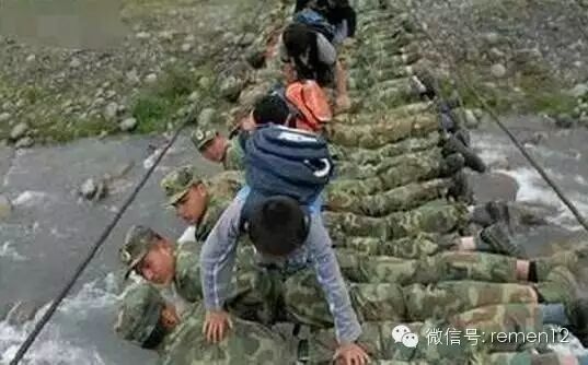 武警战士搭起人桥,为上学的孩子打通生命通道。