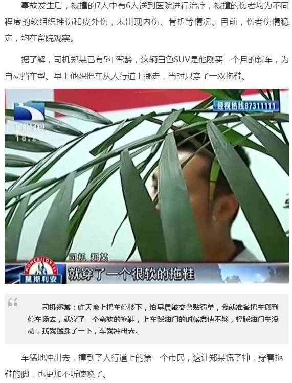 司机郑某:我踩刹车结果拖鞋是滑的,又踩到油门上去了。