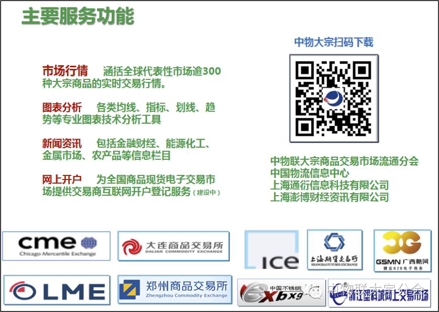 中物大宗是由中物联大宗商品交易市场流通分会、中国物流信息中心、上海通衍信息科技有限公司和上海澎博财经资讯有限公司共同建设的行业公共信息服务平台之一。“中物大宗”的服务功能,主要包括市场行情、图表分析、新闻资讯和网上开户四大板块,涵括国内外、期现货等全球代表性市场逾300种大宗商品的实时交易行情。今年下半年,分会还拟推出“中国大宗商品综合指数体系”和“中物大宗”双语版。