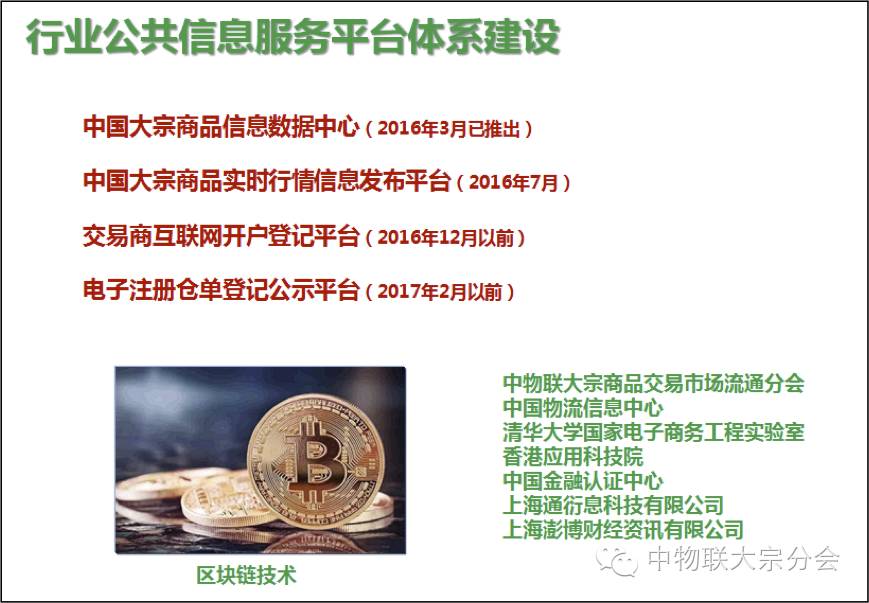 分会行业公共信息服务平台一期建设项目,主要包括:中国大宗商品信息数据中心、中国大宗商品实时行情信息发布平台、中国大宗商品交易商互联网开户登记平台和中国大宗商品电子注册仓单登记公示平台。2016年6月,分会与清华大学国家电子商务工程实验室、香港应用科技研究院、中国金融认证中心和上海通衍信息科技有限公司等有关单位就共同推动区块链技术在我国大宗商品现代流通领域中的应用达成合作意向,并签署了相关合作协议。中国大宗商品交易商互联网开户登记平台和中国大宗商品电子注册仓单登记公示平台有望在今年下半年正式推出。