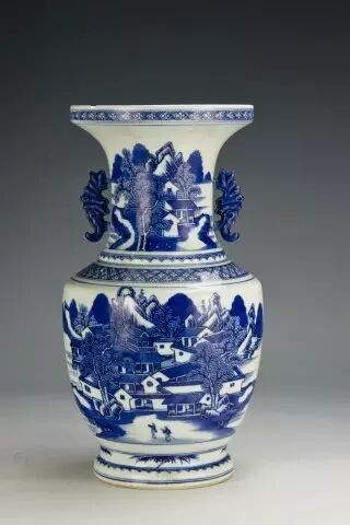 清 乾隆青花山水人物螭龙耳盘口瓶 H38cm