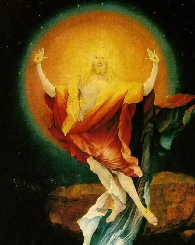 "Isenheim Altarpiece"(《伊森海姆祭坛画》),Matthias Grünewald作于1512-1516年间。这里展示的是这幅画中间和右侧翼的两处截图。天使和背后晕轮的色彩层次被本雅明称作“彩虹”,他认为,对万丈光芒的观照是从墨绿的暗色深处折射而来,是对灵的直击。因而他称赞此画作超离了表现形式(das Ausdruckslos)。图片来源:www.musee-unterlinden.com
