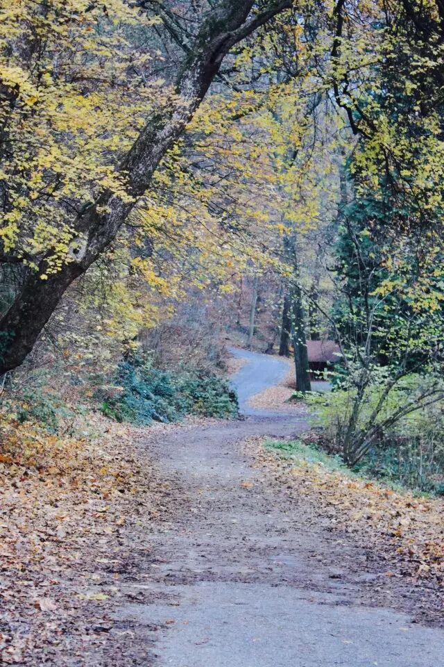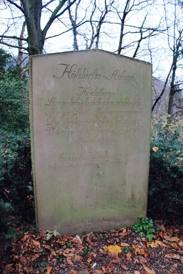 荷尔德林的纪念碑在哲人小路深处的一侧树林里。小路的尽头是通往山道的落叶林,高高的树上残留着深秋风雨后的点点黄叶,它们向小道偏偏竖立,亦远亦近,像一片深广的时空,这时候自然会想到何谓引人入胜。