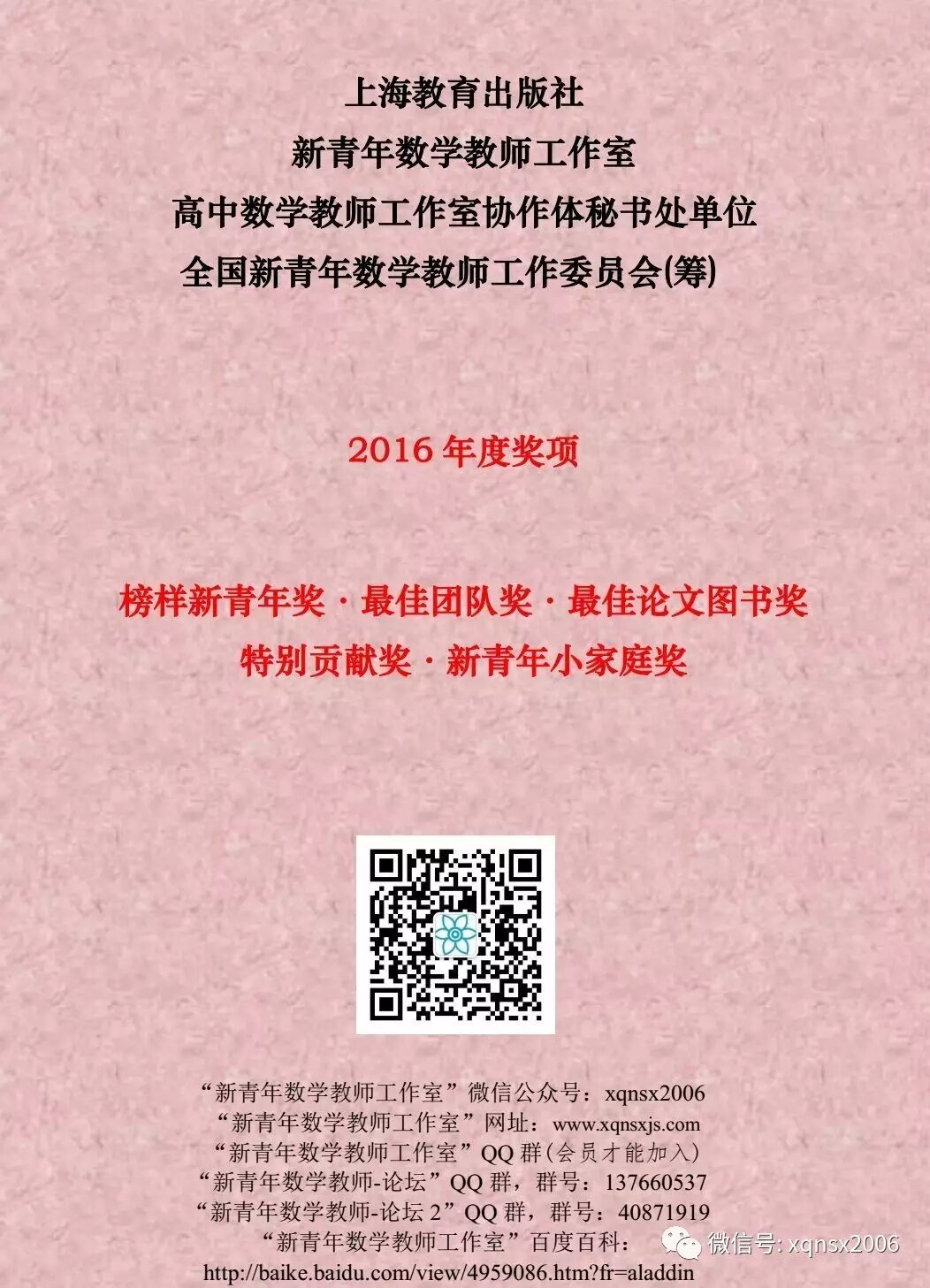 经过一年的辛勤耕耘,新青年数学教师工作室在2016年取得了满满的收获:举办了庆祝工作室成立十周年系列活动、发展了新成员、召开了第三届全国新青年数学教师发展论坛、发展了两个教研基地、组建了两个分站、发表了许多质量较高的论文、结识了许多青年数学教师朋友……在认真总结工作室2016年工作的基础上,经过工作室秘书处推选、常务理事会讨论通过并向全体成员公示,最终确定了新青年数学教师工作室2016年度奖项。
