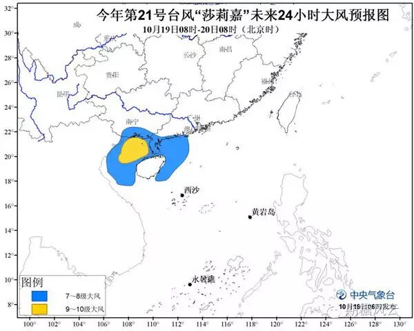 今年第21号台风“莎莉嘉”昨天(18日)晚上由台风级减弱为强热带风暴级,今天早晨5点钟其中心位于中越交界处南偏东方向130公里的北部湾海面,就是北纬20.4度、东经108.3度,最大风力有10级(25米/秒),中心最低气压985百帕。