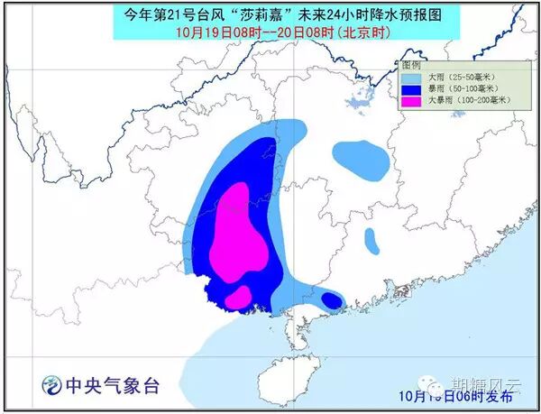 降水预报:19日08时至20日08时,广东西南部和北部、广西中西部和南部、贵州中东部、湖南西部和中部等地有大到暴雨,其中,广西中部偏西、贵州东南部等地的部分地区有大暴雨(100~200毫米),最大小时雨强可达40~80毫米。
