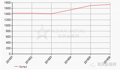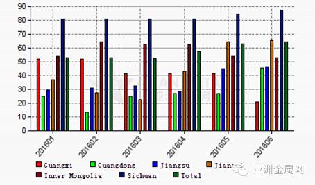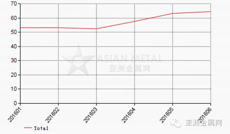 2016年6月份稀土原矿分离厂平均开工率为64.46%,与5月份的63.16%环比上涨1.3%;较2015年6月份的48.07%同比上涨16.39%。2016年1-6月份氧化镨钕生产商平均开工率依次为:53.13%、53.13%、52.38%、57.59%、63.16%和64.46%。总体来看,2016年上半年中国氧化镨钕生产商平均开工率为57.31%,与2015年上半年的49.63%同比上涨7.68%。