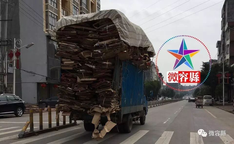 中环西路路段,一辆正在行驶的货车载满了纸箱皮,这些纸箱皮高出了车身两三米,并向两边各伸出车身一米多,车尾后面的纸箱皮也露出车外一米多,让人看了真担心,万一纸箱皮掉不车砸到人就不好了,遇到类似这种超载的车辆还是远离些吧。