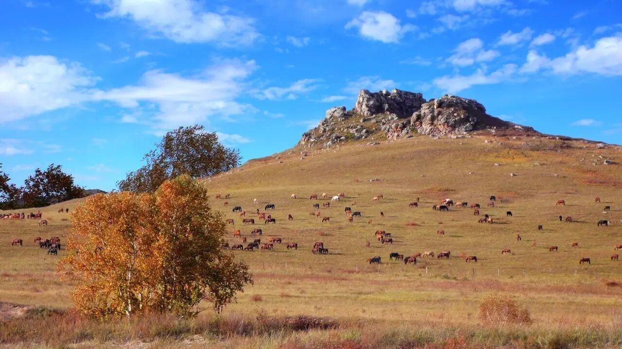 蓝、水清、山黄层叠,马鹿、旱獭、