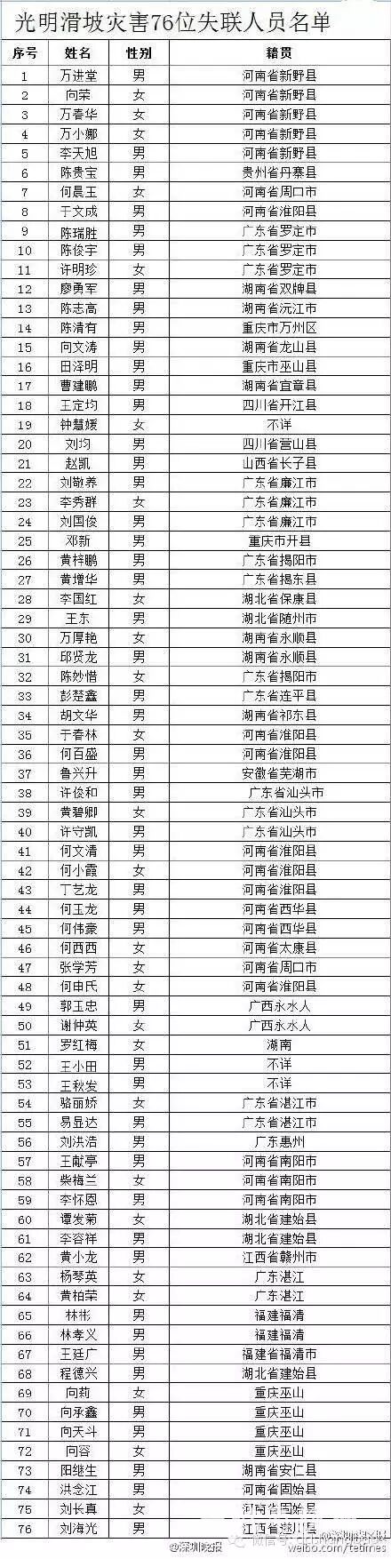 最新权威发布:“12.20”光明滑坡灾害76位失联人员名单。深圳特区报记者现场报道:今天下午,“12·20”光明新区滑坡灾害现场抢险救援指挥部公布了76位失联人员名单。据现场指挥部第五次新闻发布会消息,目前最新失联人数为76人。(深圳特区报)