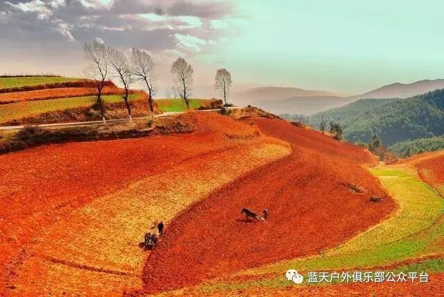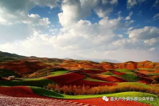 “东川红土地”位于昆明市以北偏东方向,因当地高温多雨下发育而成的红色土壤让这里变得不一般。