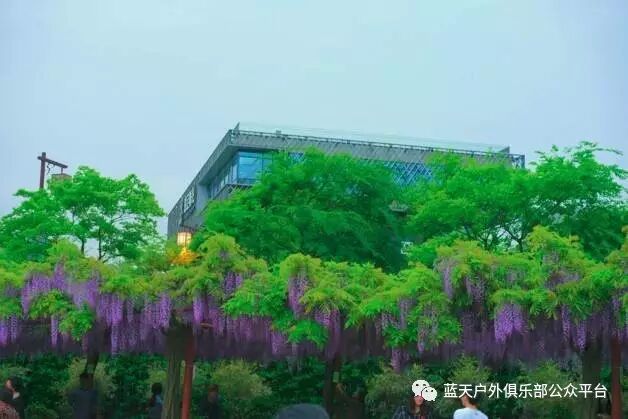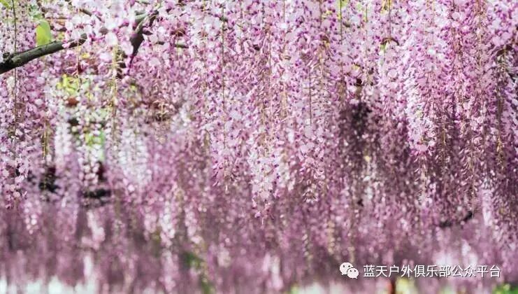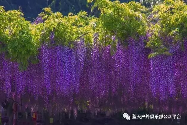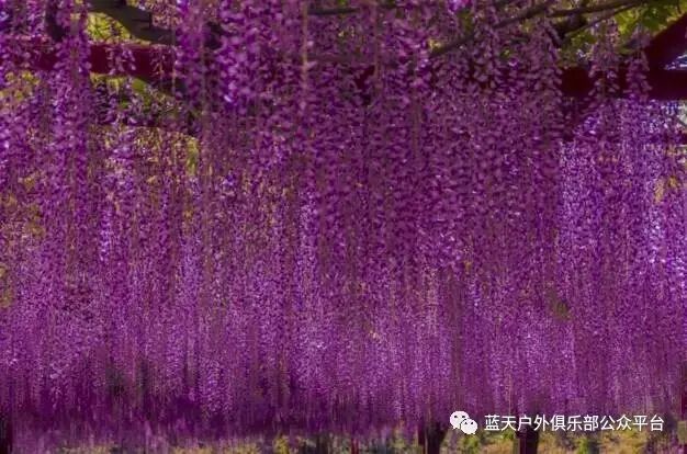 最为吸睛的还是一望无边悬挂的紫藤,就像是一片长在天空的薰衣草田,浪漫至极。