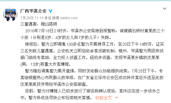 :7月18日广西岑溪市一家三童遇害案(8岁、4岁的女儿和7岁的儿子)告破,该案嫌疑人为同村的13岁男孩沈某某,已被警方控制,其对犯罪事实供认不讳。